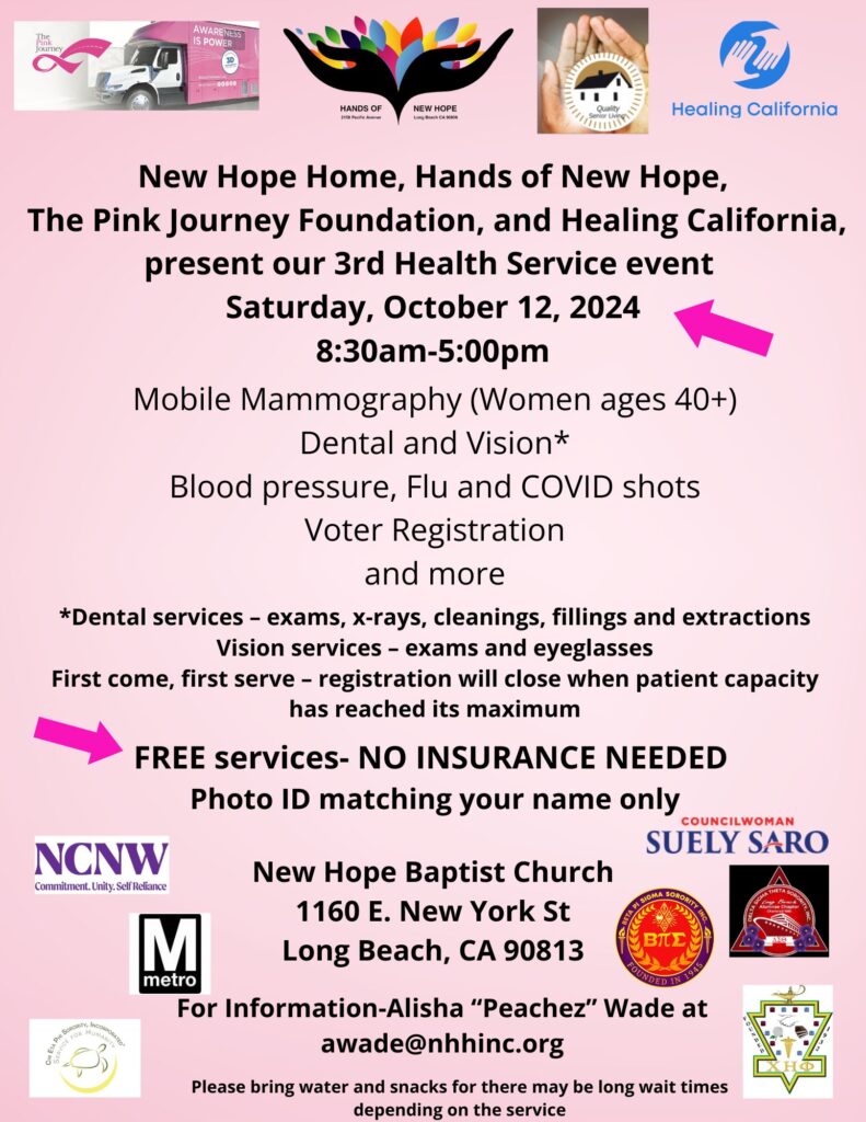 Long Beach, CA – New Hope Home, in collaboration with partners, Hands of New Hope, The Pink Journey Foundation, and Healing California, is proud to present the 3rd Annual Free Community Health Service Event on Saturday, October 12, 2024, at New Hope Baptist Church, located at 1160 E. New York St, Long Beach, CA 90813. This day-long event will run from 8:30 AM to 5:00 PM and is open to the public, offering essential healthcare services to residents of Long Beach and surrounding areas. No insurance is required, and all services are free.